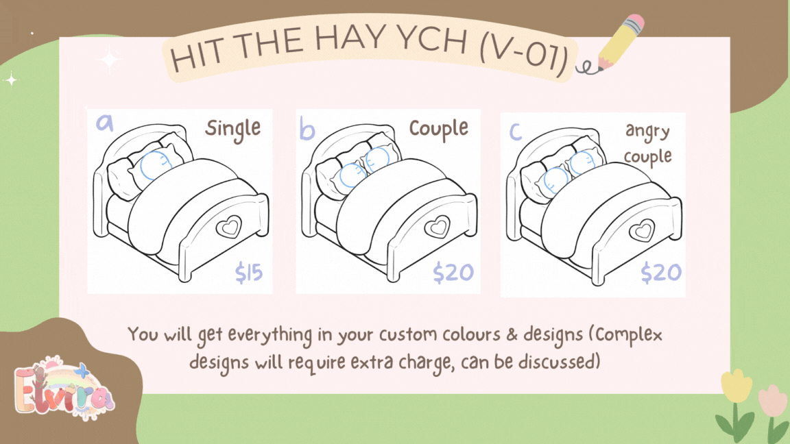 ﹒The client has the right to issue and suggest as many changes as needed to their liking. A rough sketch, refined sketch, and flat colored version will be delivered through whichever contact method is best. If the client wishes for something to be changed, it MUST be done before the rendering stage. The earlier the changes are made, the easier and faster the changes can be done.